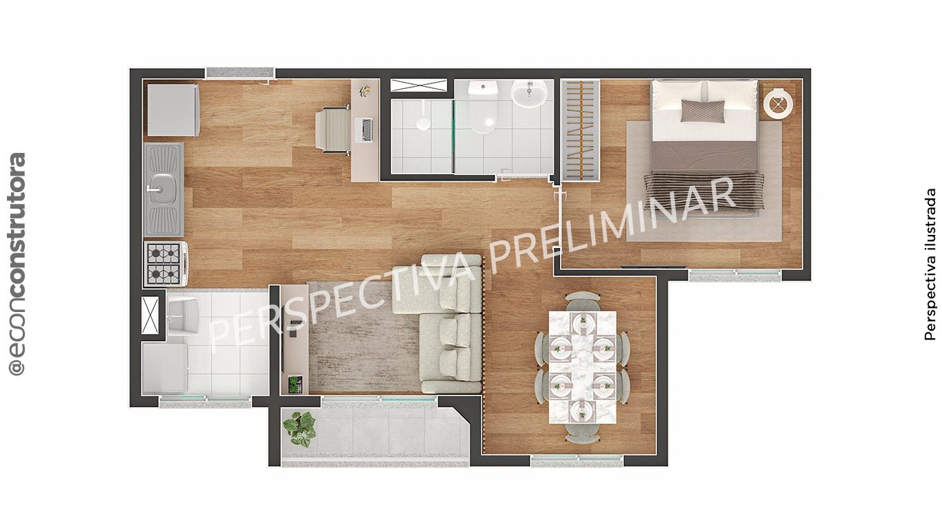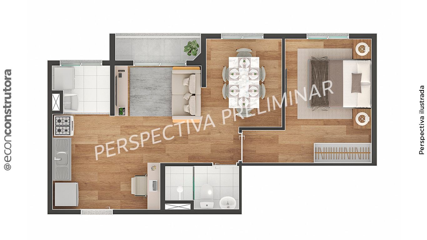 O projeto oferece tipologias funcionais com plantas versáteis e bem distribuídas. Todas as unidades contam com varanda e integração de ambientes, permitindo mais luminosidade e ventilação.