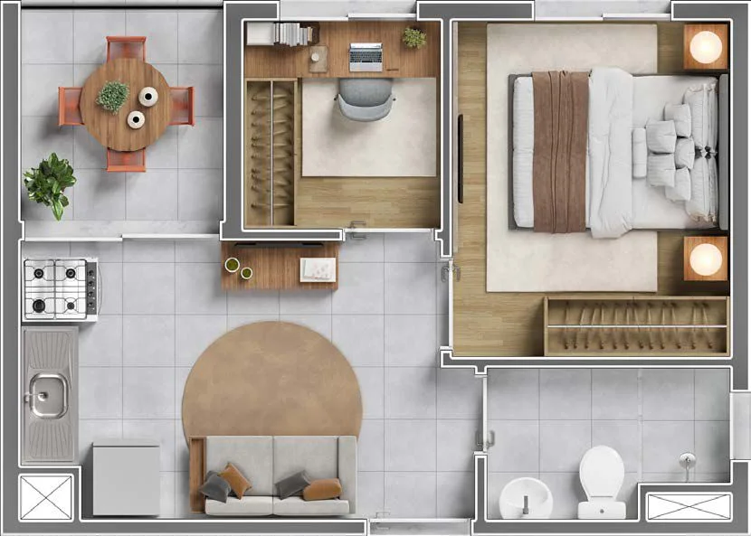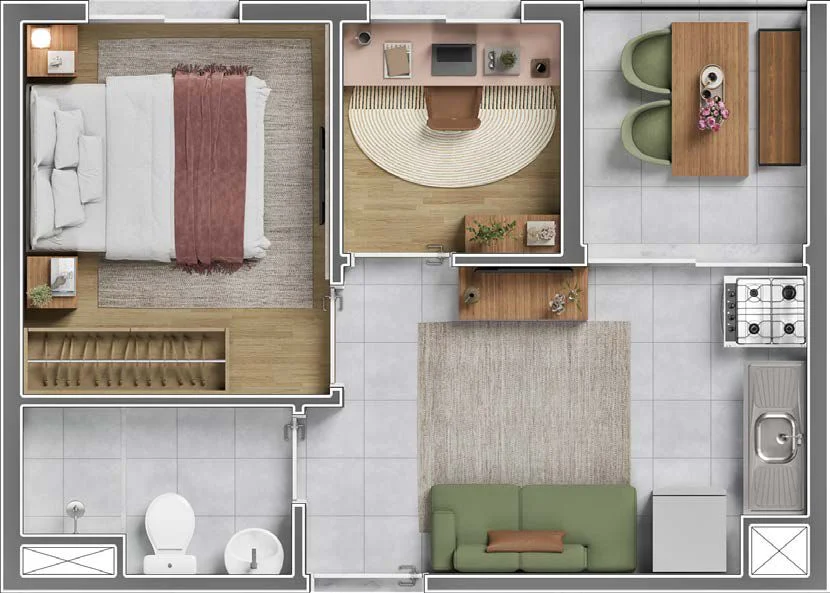 1 Dormitório + Office (29 a 41 m²) — perfeito para quem trabalha em casa.